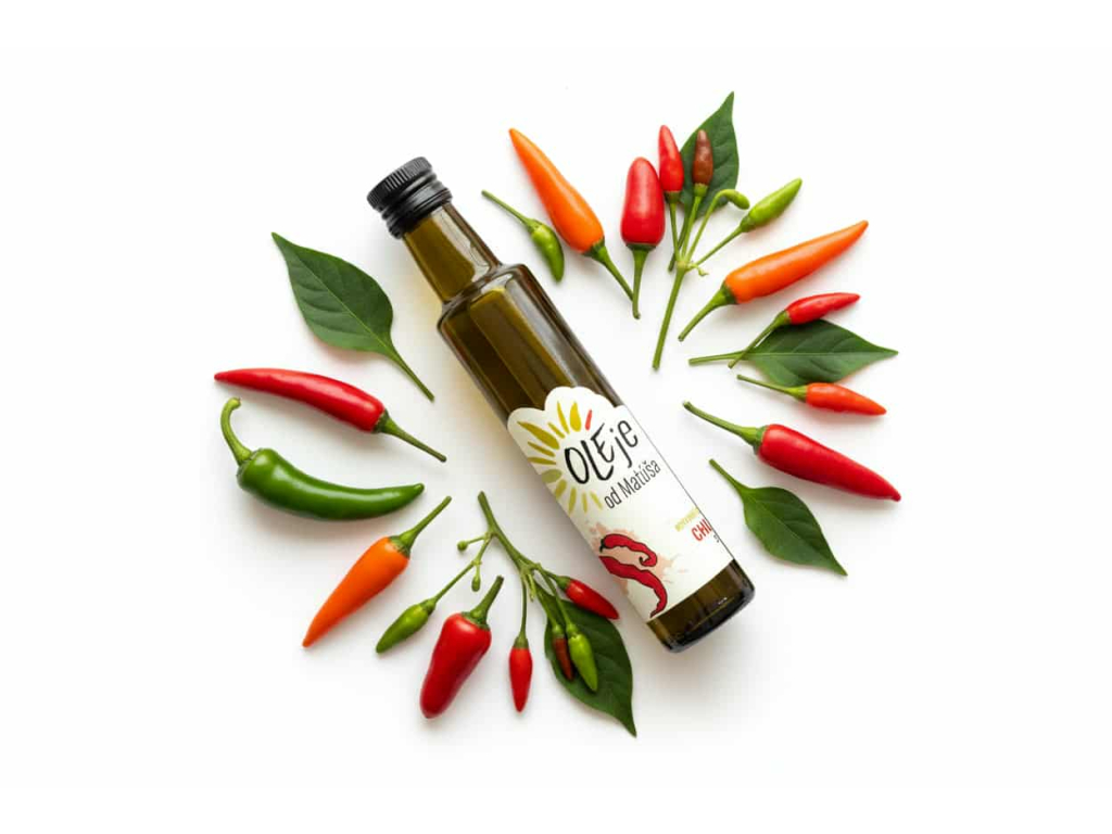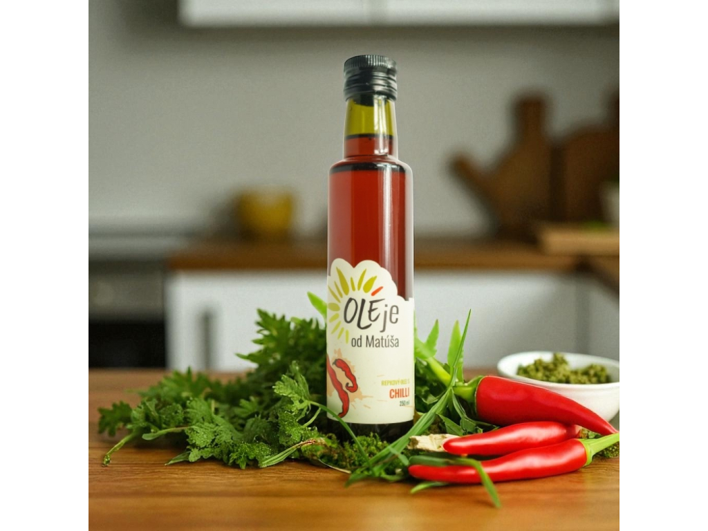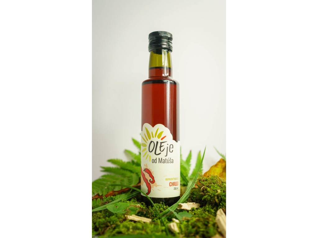 Pikantní chilli olej s červenou barvou a intenzivní chutí. Ideální k pizzám, nudlím, omáčkám i grilování. Macerovaný za studena po dobu 6 týdnů.