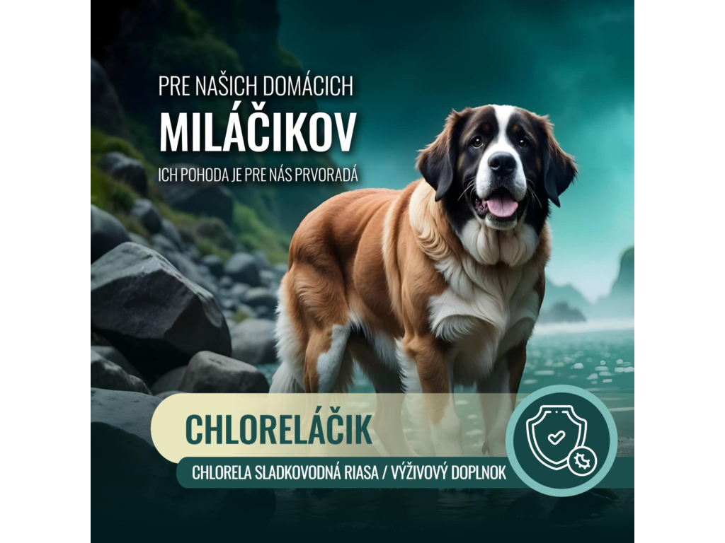 CHLORELAČIK je doplněk stravy na bázi chlorelly – sladkovodní řasy, která je považována za jednu z nejbohatších superpotravin na světě. Obsahuje chlorofyl, proteiny, minerály, vitamíny skupiny B a antioxidanty, které podporují detoxikaci, regeneraci a celkové zdraví zvířete.