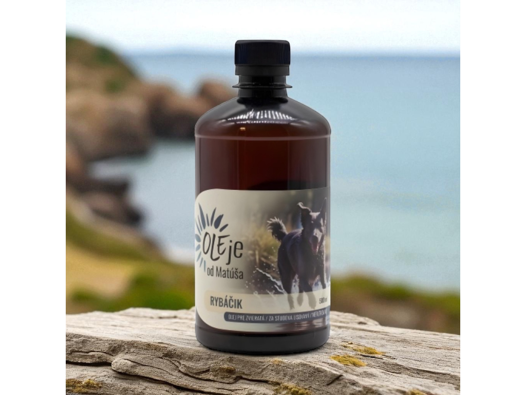 Náš Rybáčik je unikátní směs olejů z lososa, sledě, makrely, platýse a šprota – přírodní koktejl omega-3 mastných kyselin a vitamínu D. Je ideální pro všechny psy – od štěňat po seniory – kteří potřebují podpořit zdravou srst, pokožku, klouby i srdce.