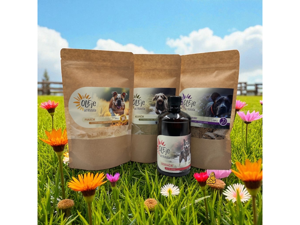 - Lososačik – lososový olej s omega‑3 mastnými kyselinami pro vývoj mozku, zdravou srst a silnou imunitu.