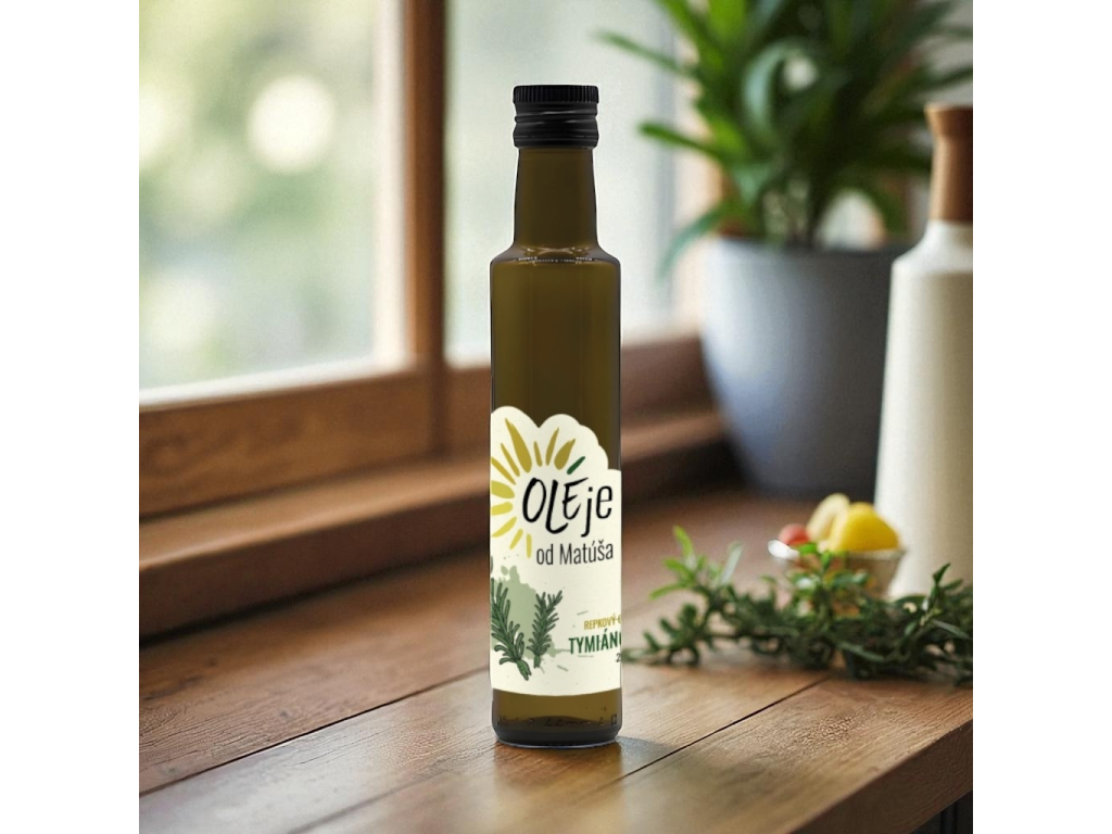 Tymiánový olej s intenzivní chutí a vůní. Skvělý do marinád, na maso i zeleninu. Macerovaný za studena 6 týdnů, bez chemie.