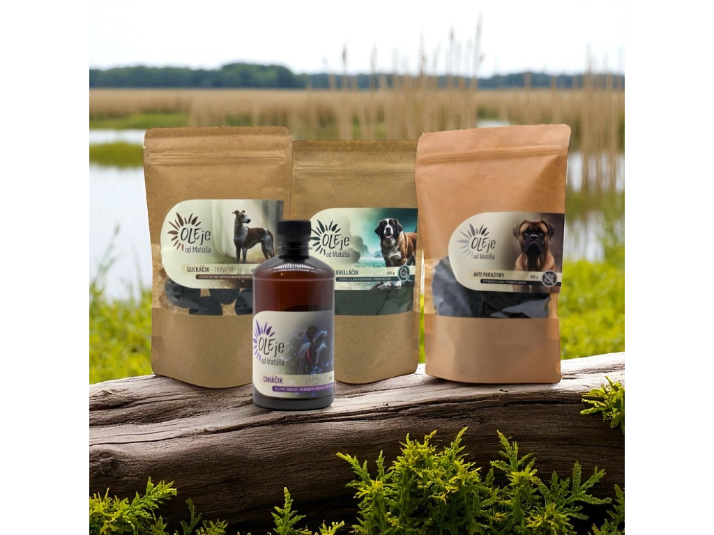 Malý balíček obsahuje: Ľanačik 0,5l, Chlorelačik 250g, Guľkačik s aktívnym uhlím 250g, Antiparazitky 0,5kg.