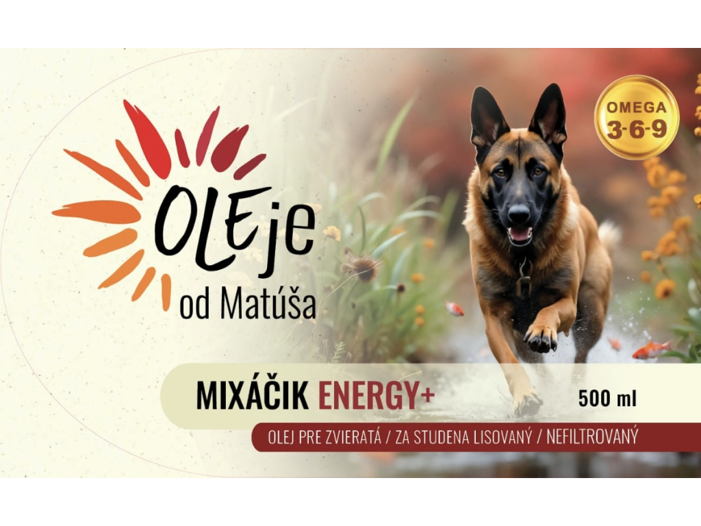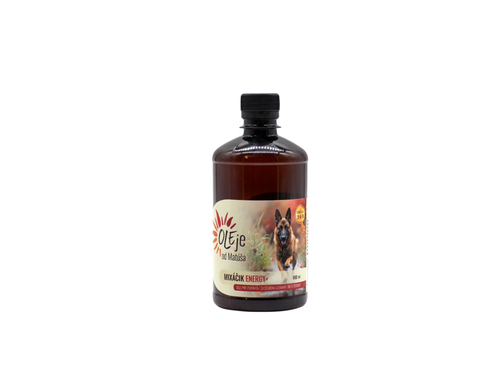 Prírodná zmes ľaničníkového, konopného, černuchového a rybieho oleja pre energiu, vitalitu a regeneráciu psov.