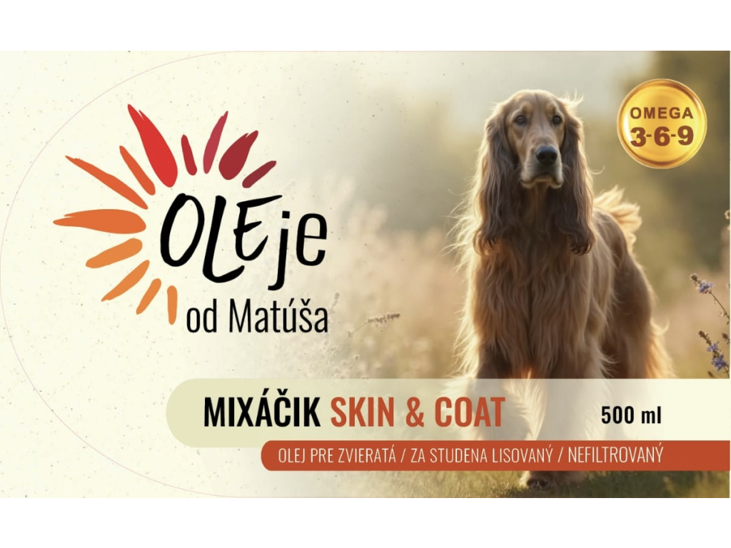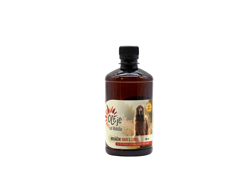 Dopraj svojmu psovi prírodnú starostlivosť zvnútra – Mixačik SKIN & COAT+ je funkčná olejová zmes lisovaná za studena, ktorá podporuje zdravú pokožku, hustú srsť a žiarivý lesk.